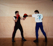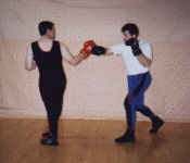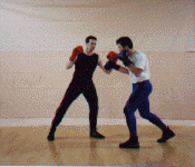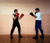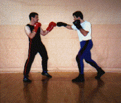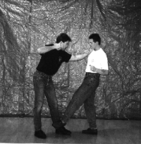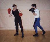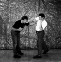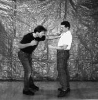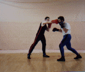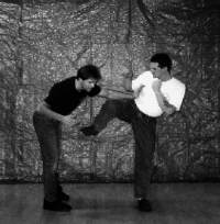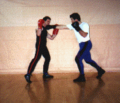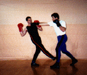 Below: Savate was formally trained as a street defense and used the shoe for its defense weapon. The opponent left grabs the defender and brings the hands up to execute a blow. The defender delivers a Coup de pied ba (low kick) to the inside ankle of the opponent before he can attack. the defender strikes with a rear cross known as Coupe de pong, immediately follows into a kick known as Chasse ba (low side kick).