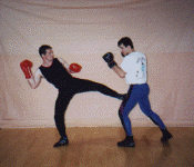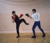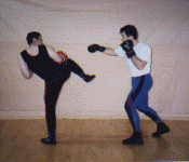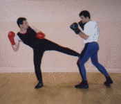 Ring & Sport techniques of Savate: Attacker left; executes a (Frontal Chasse) side kick with heel to the opponents front thigh, Defender right; counter attacks with a rear cross punch attacker left simultaneously parries the punch and delivers a (Coupe de pied ba) low kick to the shin of the opponent. Attacker left immediately executes a (coup de pong) rear cross to the opponent head. A (Foutte Ba) low kick with instep is thrown to the inside of the opponents thigh. Attacker spins and parries the opponents punch while simultaneously executing a spinning (Chasse) side kick to the opponents midsection.