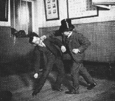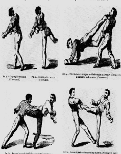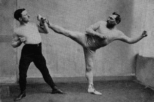 When Savate's popularity had spread over France it gained notoriety through other practitioners as well. This shared experience came when Spanish sailors shared the same sea's as France. It was not uncommon to have French and Spanish sailors aboard one another ships under slavery, war, and stowaway circumstances in the 1600 to 1800 century. Other items merged from this mixer of activity were weapons. Weapons such as the La Baton, a seven foot staff rod approximately one inch diameter were commonly practice by Savate practitioners. It was particular famous among hillside and farming communities of France and Spain. There is no particularly evidence on where the La Baton came from but it has been suggested that this weapon came into existence by farmers and sheep herders tools such as walking staffs and garden tools. The more famous and popular weapon incorporated by Savate is the La Canne. A 1/2 inch diameter flexible stick approximately 36 inches in length. Savate combines traditional fencing motions along with kicking techniques when wielding this dowel shape stick at the opponent. This weapon is fast and flexible making it a fierce companion. La Canne is a mimic relic of the fencing foil which has been famously lead by French masters for centuries. The La Canne was frequently used in the late 1800's as a walking stick and fashion statement by gentleman of the times. The public may have seen men walking with a cane and properly dressed as a important figure of the public, but hoodlums and robbers saw them as victims. The defense techniques of La Canne & Savate proved worthy against unwelcome criminals that had planned to take ones purse or life in unsafe streets. Unlike the western world firearms were not available to the public as a mean of defense. As with many empty hand techniques that are founded, it provides a well resource for self protection purposes Charlemont in 1920 performing Savate with street cloths and top hat. Savate had originally come from the streets of France and was used as a self-defense form at any giving time.