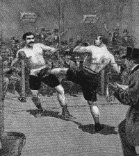 Below: Perhaps one of the most important single documents of Chausson is a sketch from 1847 of sailors displaying kicks against one another. Ship was rope used as boundary markers when bouts took place and technique of touching the deck with the hand for balance was common.