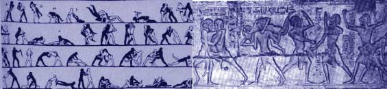 | The art of wrestling as a sport and method of defense goes further back in time than any other excising records of empty hand combat. It can be traced back as far as 3400 BC when the Egyptians practiced wrestling as a favorite past time event event. These recorded images of wrestling artifacts can still be seen today in the tomb walls of Beni-Hasan Egypt and relief images from the tomb of Vizier Ptahhotpe in Saqqara. More reveling is the exact methods used in today's wrestling are in scripted upon these same walls. These paintings and images date back as far as 2300 BC. | |
